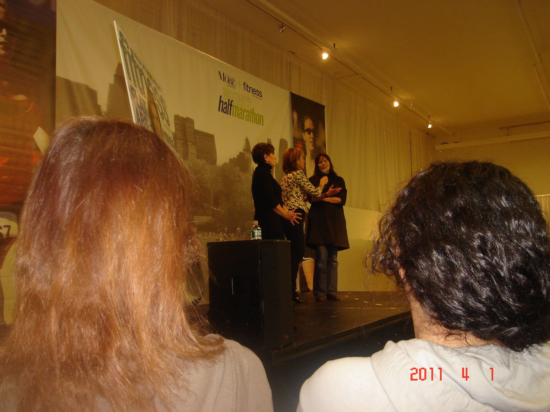 The health expo is great. They offer a lot of information and vendors are there too. You walk away with a lot of stuff. I walked there from my hair appt and then back to the hotel. Round trip was probably 3.5 miles. The day started out though at 4:00 am – that’s when my alarm went off to get ready and be at the NBC Today Show broadcast at 6:45. I met up with the More Magazine staff there and they were all really nice. There were a lot of other runners there also. One group that was in front of me was from Canada. Another, from Ohio. I was holding my umbrella, a thunder stick and this sign that I made with a “Swiffer” handle. I printed pages out before I left home and taped to file folder.