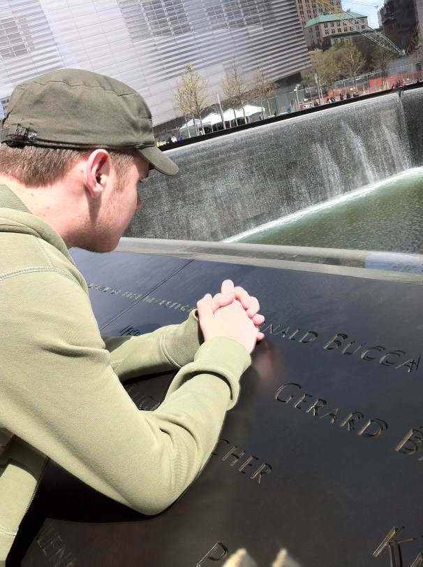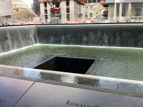 Monday (Day 4)- Headed to the New 9/11 Memorial. We have been to Ground Zero on previous trips, which is always very surreal. The new Memorial has a waterfall and reflecting pool that is an acre in size and each is in the exact spot of the World Trade Towers that were destroyed in the 9/11 attacks. The names of the almost 3,000 that lost their lives are inscribed around the outside of the water fall. They say at night, the lights from beneath the Memorial, shine through the cuts in the metal that make up the letters of each name. The museum is not open yet and the site still has much construction around it.