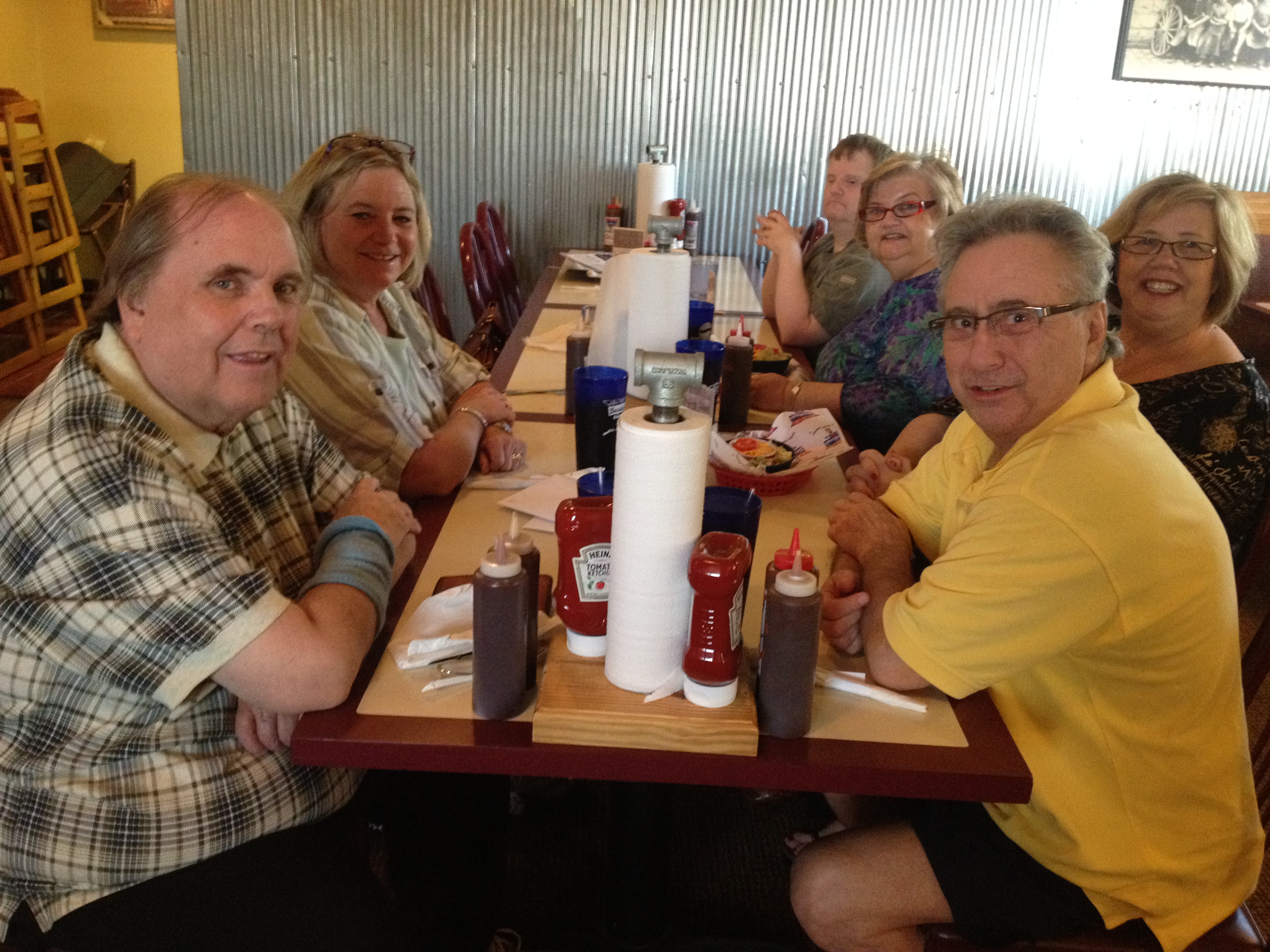 Today was my brother George’s birthday, so we celebrated it at Bandana’s BBQ. I stuck to my diet (Chicken breast 3 ounces – no skin with baked potato (lemon no butter) and green beans. I’m sure green beans and chicken were salted pretty good but since I took skin off I shouldn’t have too much of a problem. Also stuck to water. We always have a good time getting together. This group here could tell ya some tales. We have had some pretty good times. Dolores’s husband Tom was still working and Jim was busy taking care of a project for Alex who was with the band.