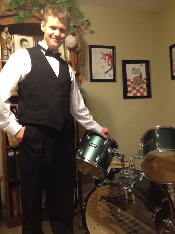 After Alex made it home, I had him pose for a picture with his concert uniform on. He’s a drummer…like his Mom was way back when. Don’t think I can’t still get on that set and rock those drums now – ha! Don’t do it too often though (I am a bit rusty too) – loved band. Alex does too.