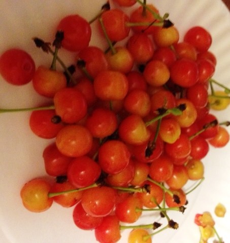 Last night Alex picked the cherries off our new tree that had ripened. I ate a cup full as one of my 2 servings of fruit I’m to have each day. They were great. Sorry about the seeds in the corner – started in on them before I took the picture – I didn’t eat all of these – there are still some left for today too. Jim and Alex aren’t that crazy about them – so I don’t have to share. 🙂