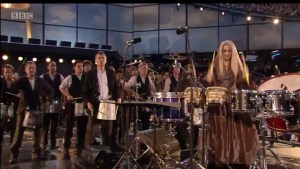 2012 London Olympics Opening Ceremony, Dame Evelyn Glennie Leading Army of Drummers. Photo courtesy of BBC