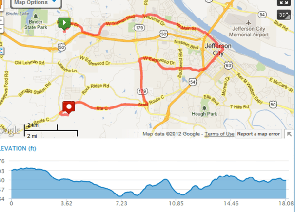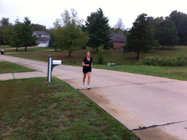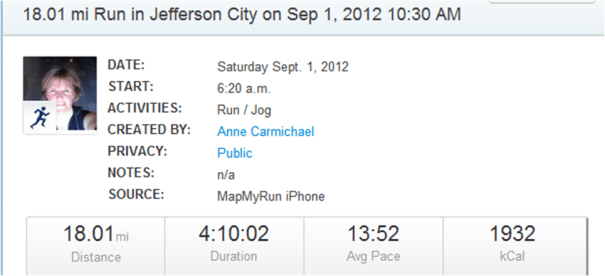 Remnants of Hurricane Isaac visited yesterday and today (Yay, we need the rain), so Dolores and I couldn’t go to the Katy Trail for today’s long run. So, I took my 18 mile run, to the streets. I ended it at Dolores’s house. Below are pictures of me finishing. It was a good run and I live to tell about it. Dolores and Alex checked in with me by phone and the apple she brought me at mile 15, was just what I needed. After finishing she had a really nice breakfast of bacon, eggs, toast, strawberries and grapes. There was plenty of water and tea too. Awesome! How nice is that?? Then we sat down and visited with the rain falling outside. Really nice. Thanks Dolores – what a nice way to finish and it made today’s run that much more special too.