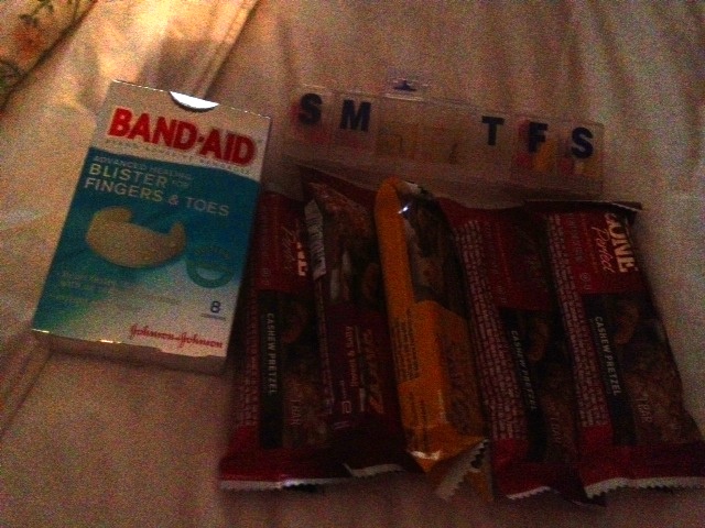 Starting to pack…here are just a few of my morning essentials. Nursing a blister on my foot from Saturday’s long run. Thus the Band-Aids for Blisters.