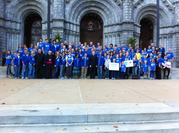 Gathering at Cathedral before Mass and Pre-Race BanquetAt our pre-race banquet we Skyped in our Singapore Chapter of runners. They lead the group of 250 their families in our Creed. This occurred at 7:45 pm CST Saturday night. It was 9 am Sunday morning in Singapore…amazing!