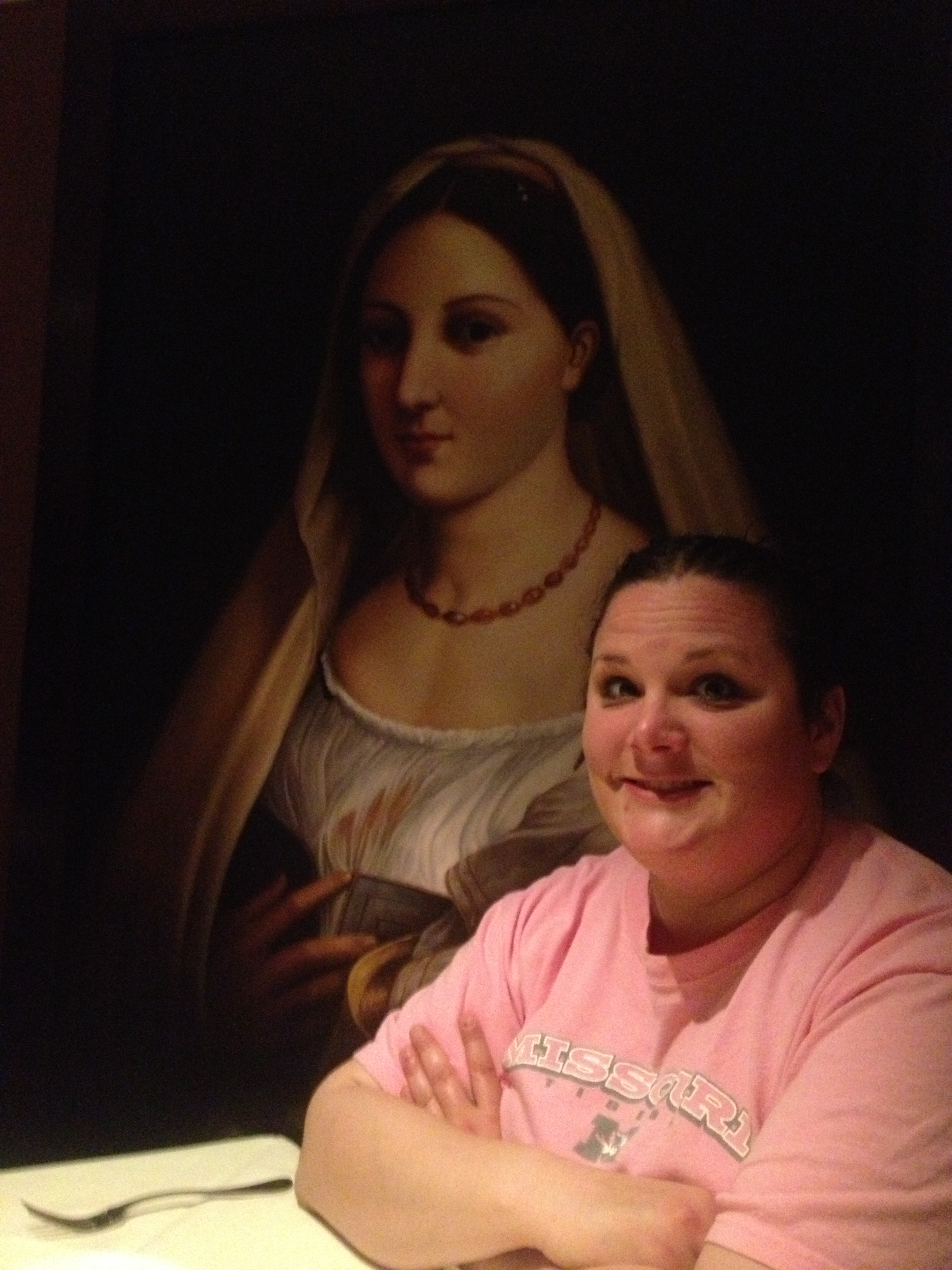 The dark and dismal Italian Restaurant that was filled with murals including one that overshadowed our table.