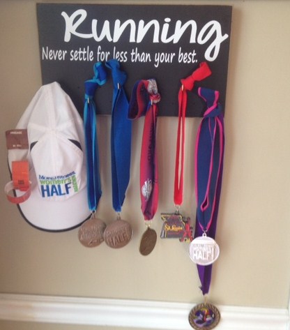 My marathon medal is shaped like Missouri. Then the rest are half marathon and this weekends 5K medal for first in age division. I gave one of my half marathon medals to Carrie who is a marathon mom.