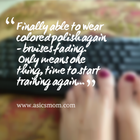 3. It means giving up the perfect looking feet/toes.  Many long-distance runners talk about losing toe nails.  Ever since my first half marathon in 2010 I have had at least 2 or more toe nails bruised from the constant banging in the shoe.  I have had so many brands of shoes, sizes, etc., and nothing changes this outcome for me.  Black polish is the only thing that covers the bruises.  For men it’s a minor inconvenience for women it’s major.